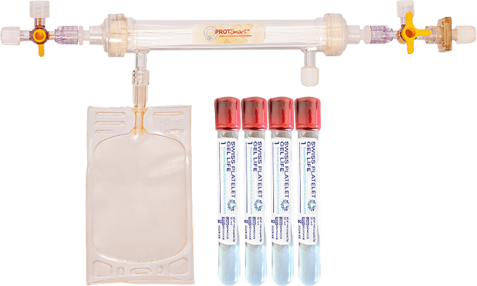 Recovered plasma is processed through the ProtSmart 6 hollow-fiber ultrafiltration device (15 kDa molecular weight cutoff). The membrane removes plasma water, salts, and low-molecular-weight solutes while retaining platelets, plasma proteins, growth factors, and extracellular vesicles. No additional centrifugation is required for concentration.